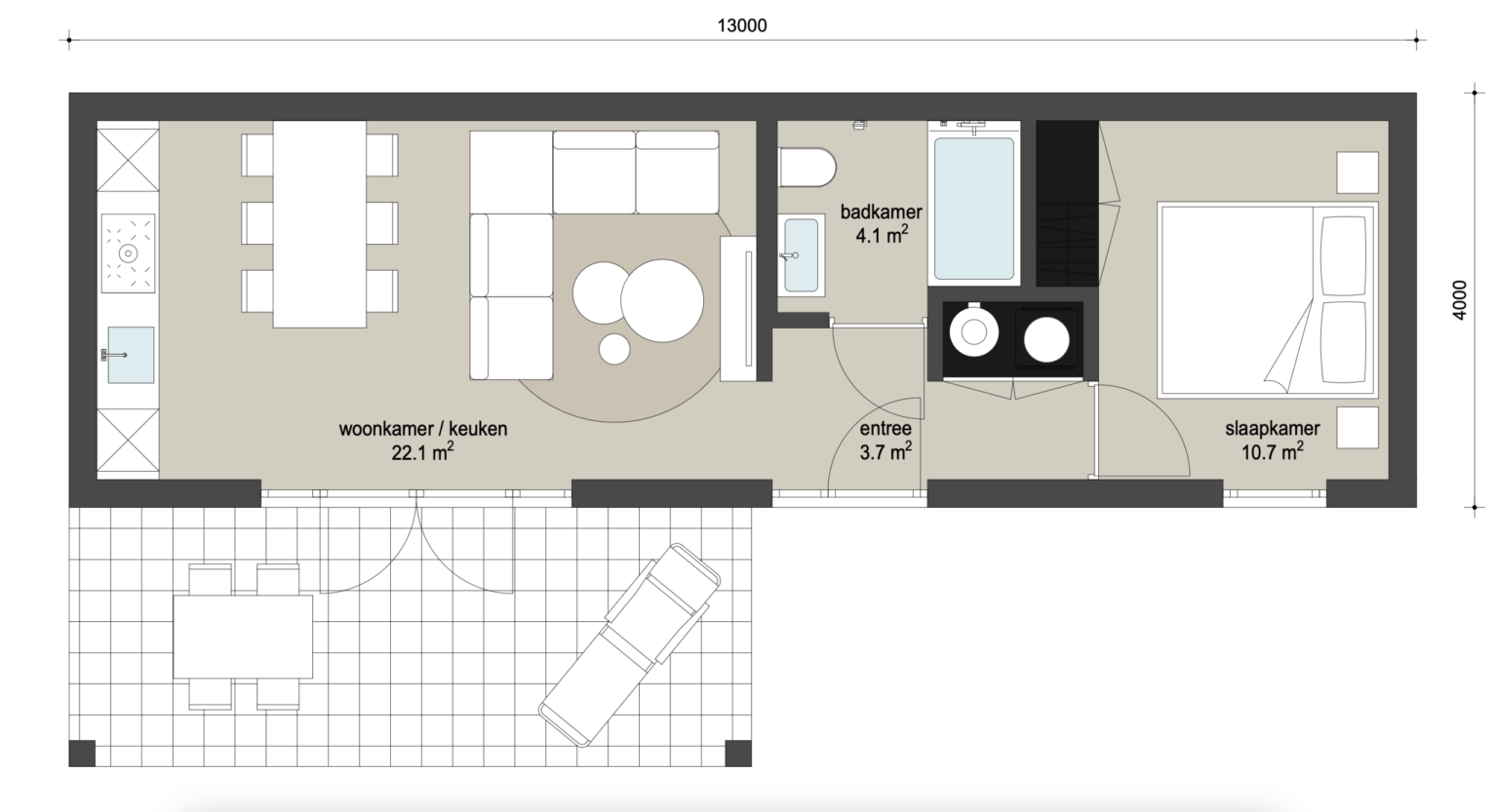 Onze mantelzorgwoningen beginnen bij 32 m² (8 x 4 meter) en kunnen worden aangepast aan uw specifieke wensen en de regels van uw gemeente.