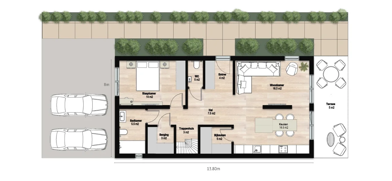 Twee verdiepingen vol wooncomfort. Beneden een ruime woonkamer, open keuken met kookeiland, bijkeuken en badkamer. Boven een hoofdslaapkamer met en-suite en dubbele wastafel. Ideaal voor gezinnen of mantelzorg met veel privacy en leefruimte.