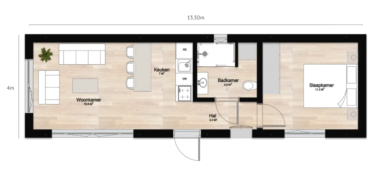 De 54 m² prefab woning van Kaynad Prefab Modulair Bouw B.V. is slim ontworpen en volledig in eigen fabriek geproduceerd, ideaal voor wie comfortabel en efficiënt wil wonen. Ondanks het compacte formaat biedt de woning verrassend veel wooncomfort en is hij geschikt als mantelzorgwoning, tuinwoning of volwaardige kleine woning voor één à twee personen. Onze referentiewoning in Koningsbosch (Limburg) laat zien hoe dit model in de praktijk wordt toegepast: modern, licht en volledig sleutelklaar opgeleverd. De indeling is efficiënt: de woonkamer van 19,8 m² beschikt over grote raampartijen en directe toegang tot de tuin, de open keuken van 7 m² biedt ruimte voor een eetgedeelte, de slaapkamer van 11,3 m² is groot genoeg voor een tweepersoonsbed en kast, de badkamer van 4,5 m² is compleet afgewerkt met douche, wastafel en toilet, en de hal/entree meet 2,4 m². Hiermee bedraagt de totale woonoppervlakte 54 m².