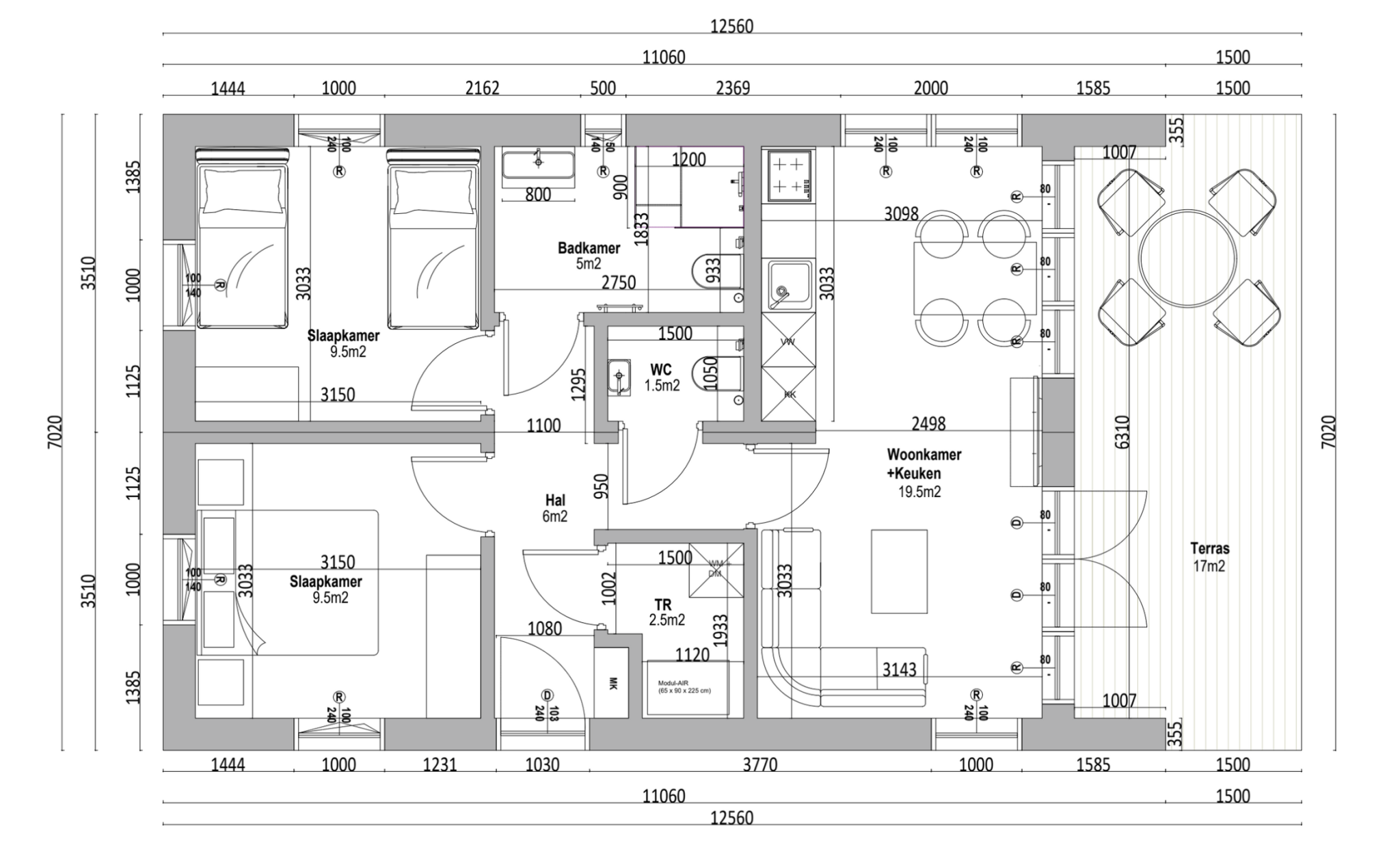 De woning beschikt over een open leefruimte van 19,5 m² waarin woonkamer en keuken samenkomen, met veel lichtinval voor een frisse en uitnodigende sfeer. Daarnaast zijn er twee slaapkamers van elk 9,5 m², ideaal voor een gezin of gasten, een volledig ingerichte badkamer van 5 m² en een apart toilet van 1,5 m² voor extra comfort. Verder is er een technische ruimte van 2,5 m², een hal van 6 m² en een terras van 17 m² om volop te genieten van het buitenleven. De woning is duurzaam gebouwd met een stevige Kerto LVL-houtskeletbouwconstructie, wat zorgt voor een veilige en energie-efficiënte structuur. Alle onderdelen worden geproduceerd met duurzame en recyclebare materialen, en de woning voldoet aan de strenge BENG-normen met hoge isolatiewaarden: vloer 3,7, wanden 4,7 en dak 6,3, wat bijdraagt aan optimaal wooncomfort en lage energiekosten.